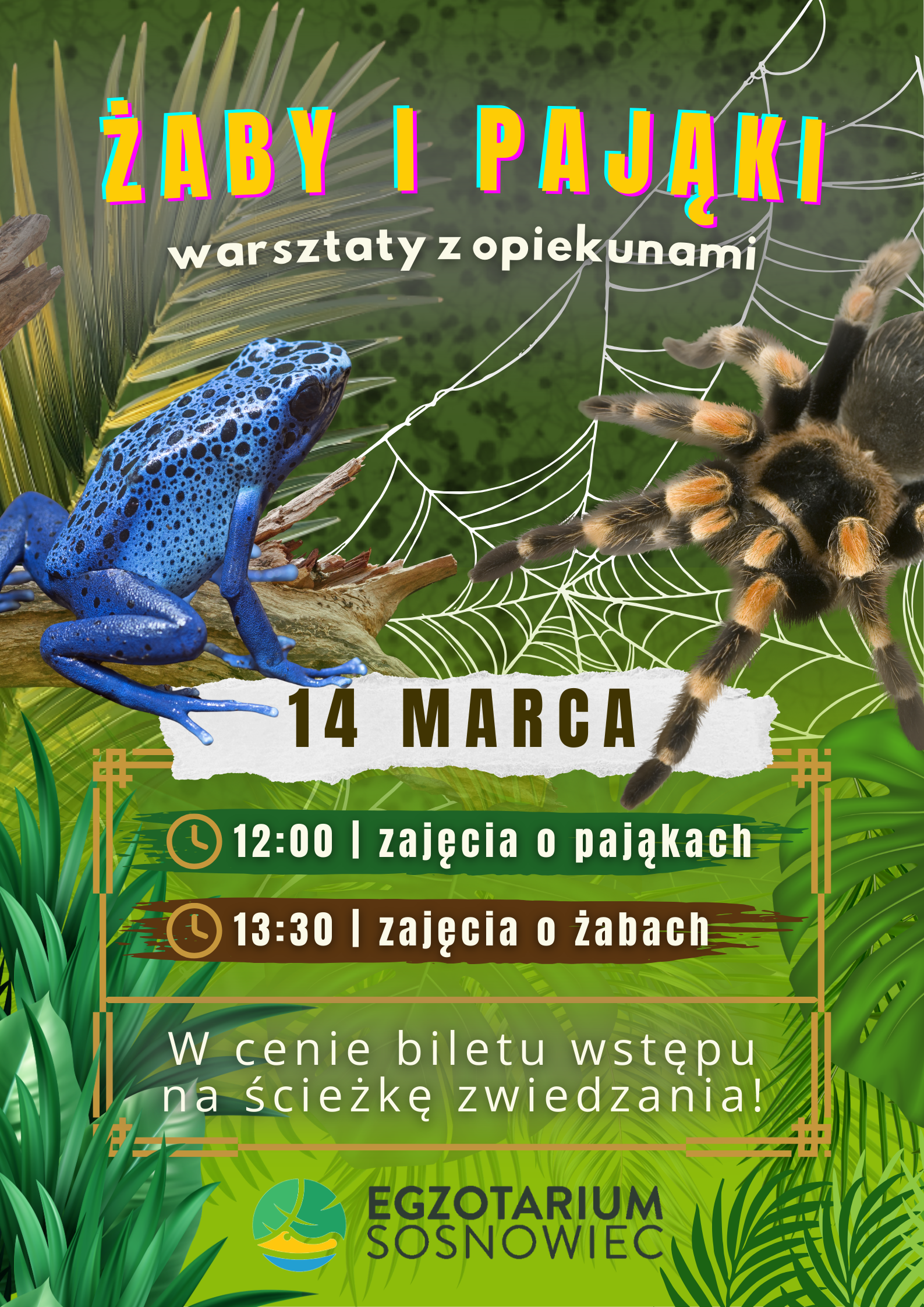 W ramach biletu wstępu na ścieżkę zwiedzania, będziecie mogli wstąpić również na zajęcia o pająkach o godzinie 12:00 oraz zajęcia o żabach o godzinie 13:30!